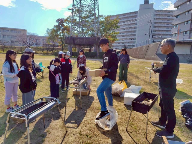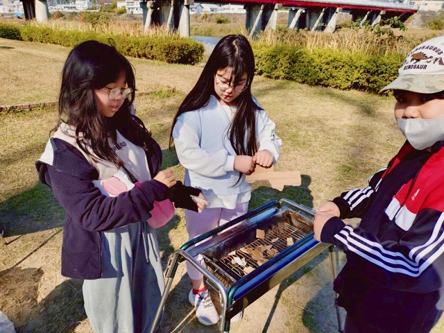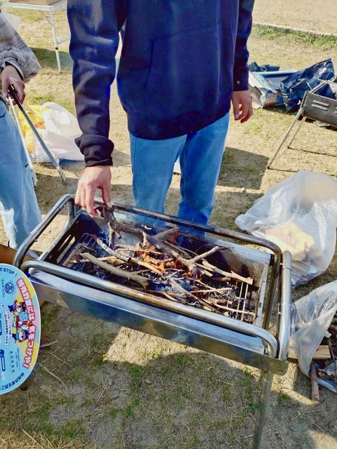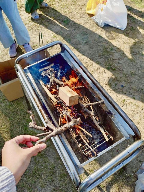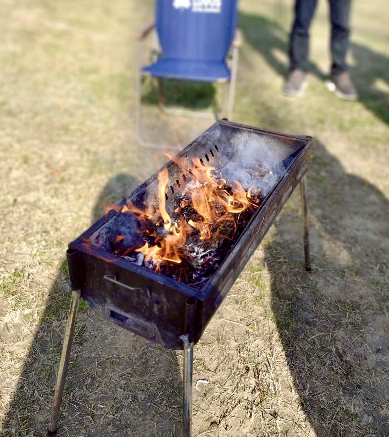 始めに、ダンボールを小さくちぎってバーベキューコンロに入れました。1つのチームはすぐに火をつけられましたが、もう1つのチームはなかなか火おこしが出来なかったので大変でした。