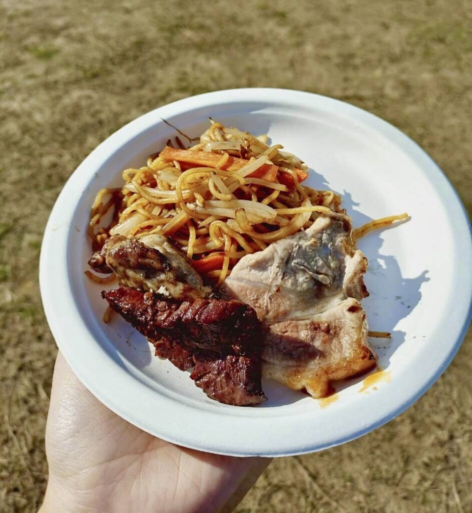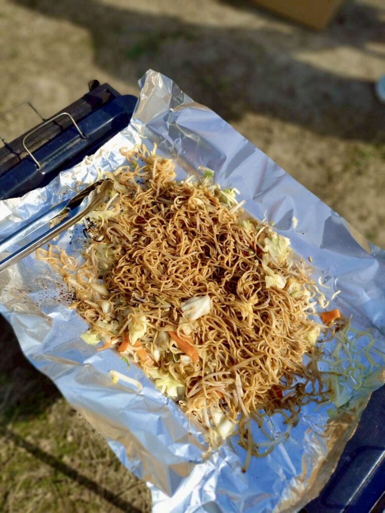 炭を入れてからバーベキューコンロの底が赤くなったので、あみを置いて肉を焼きました。肉が好きじゃない人もいたので、焼きそばとウィンナーも沢山ありました。とてもおいしかったです。