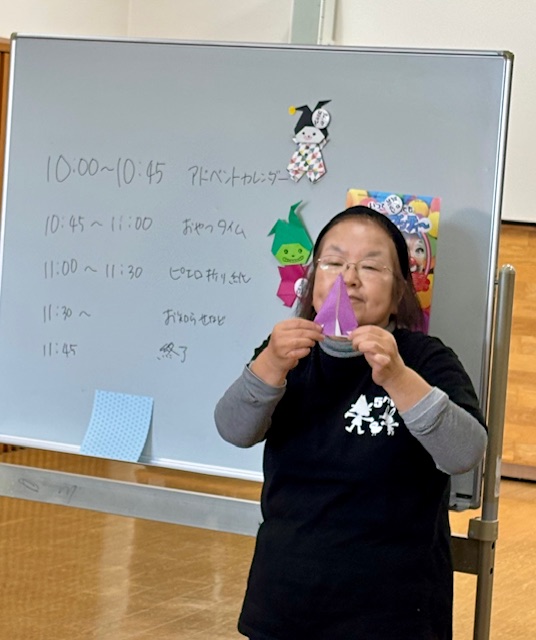 そのあと、12月例会『いつでもどこでも びりとブッチィー』にちなんで折り紙でピエロを作りました。頭と体を別々に作ってくっつけたら出来上がり。顔を描くとそれぞれ個性的なピエロが出来上がり例会が楽しみになりました。