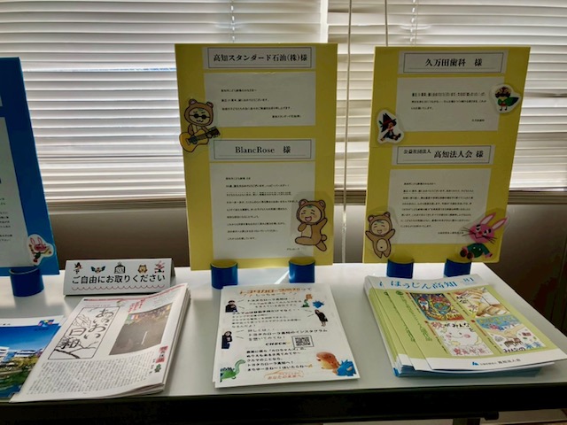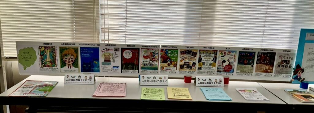 協賛企業のフライヤーやこども劇場のお知らせのチラシなどを自由に手に取れるコーナーを設け、ビデオメッセージをいただいた創造団体の例会パネルも置きました。