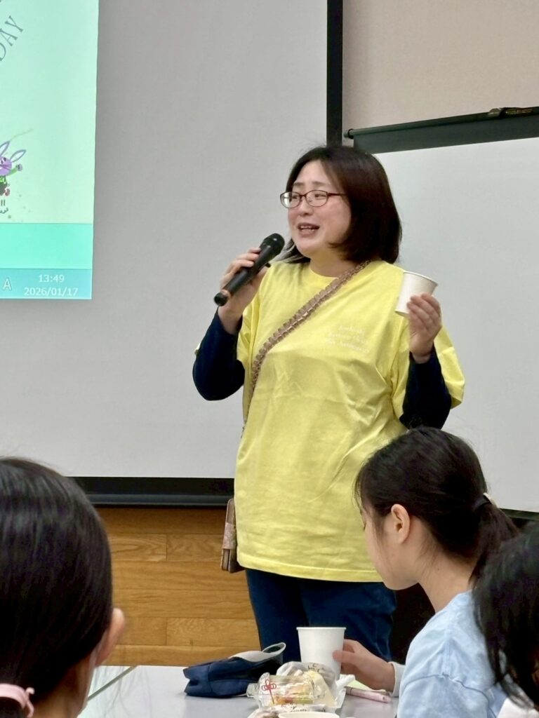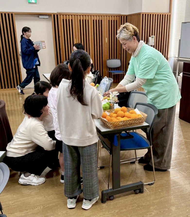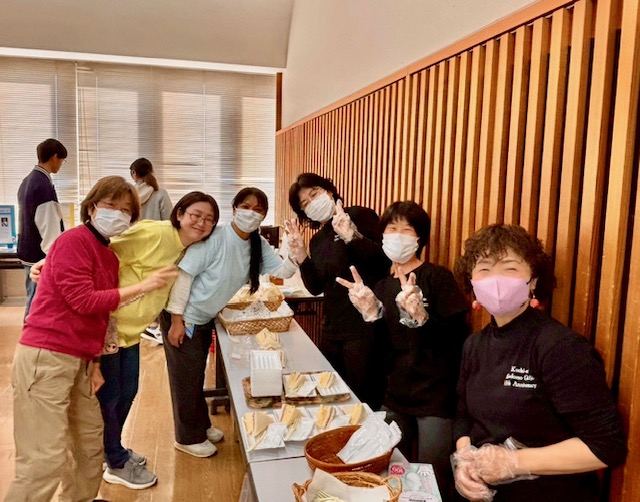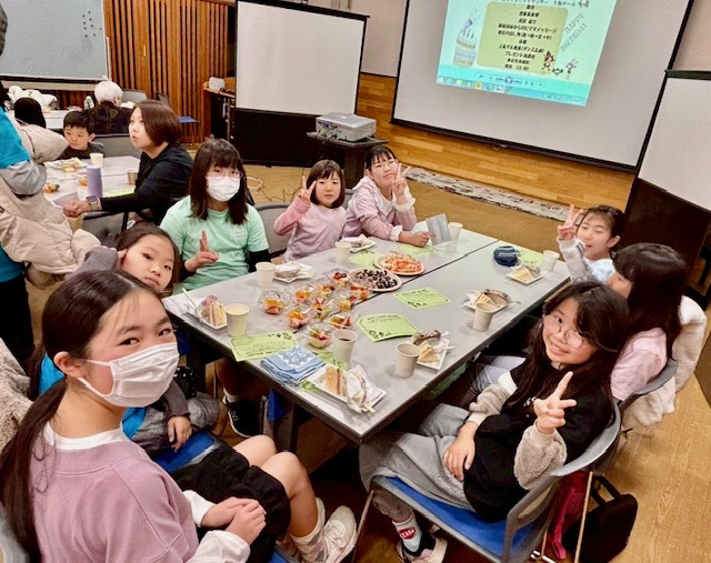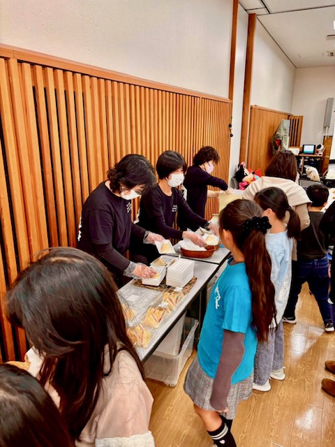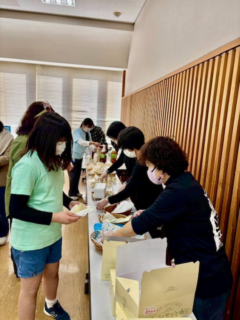 協賛企業であるサニーマートで購入したサンドイッチやフルーツパックの軽食の他、飲み物やお菓子、誕生日会なのでケーキも準備して参加者に配ります。