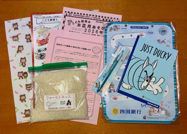 稲作事業でお世話になっている南国市コメ農家の吉本正仁さんより、こども劇場55周年祝いにと会員全員にお米『ファーストキッス』のプレゼントがあり、協賛企業の四国銀行からいただいた文具セットと共に参加者へのお土産として振る舞いました。